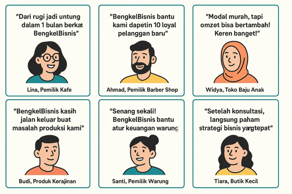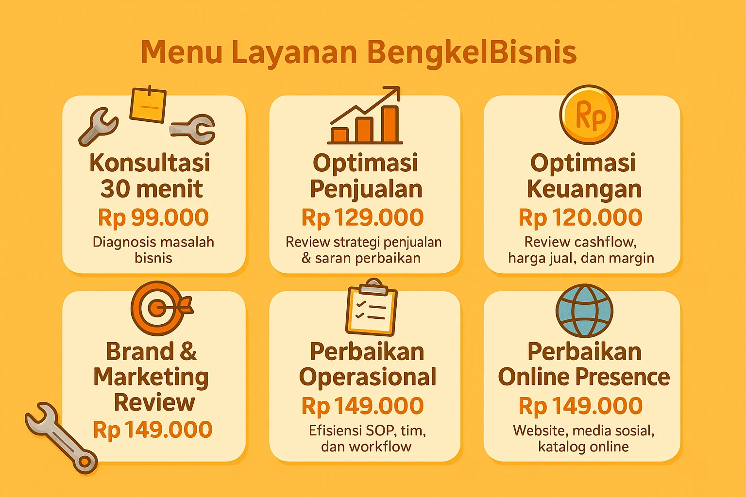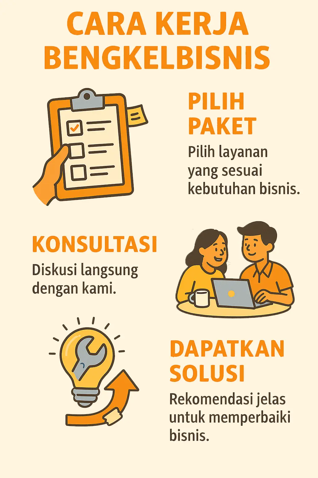 Di BengkelBisnis, kami percaya setiap masalah punya solusi yang tepat, asalkan ditemukan dari akar penyebabnya. Dengan pendekatan langsung dan tanpa basa-basi, kami mendiagnosis tantangan bisnis Anda, memberikan strategi yang jelas, dan membantu menerapkannya agar hasilnya terasa nyata. Tujuannya sederhana: membuat bisnis Anda lebih rapi, lebih efisien, dan siap bersaing di level berikutnya.