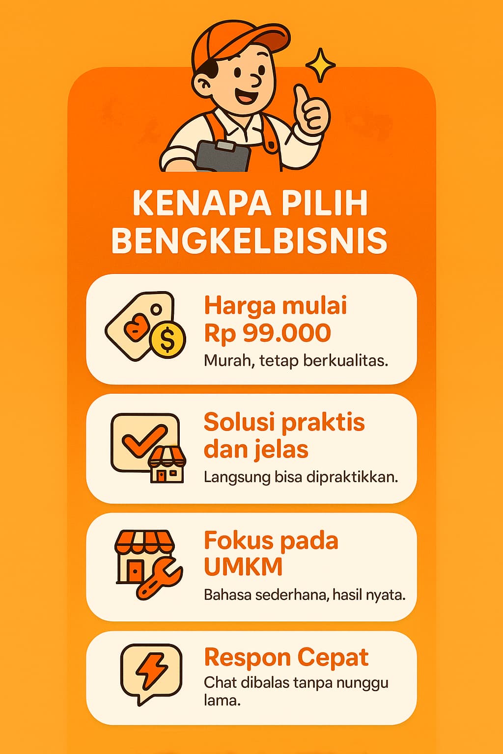 BengkelBisnis adalah layanan konsultasi praktis untuk pemilik usaha yang ingin memperbaiki, mempercepat, dan menumbuhkan bisnisnya tanpa ribet. Kami membantu menemukan masalah inti, memberi solusi yang jelas, dan memastikan setiap langkah yang diambil membawa hasil nyata. Cocok untuk UMKM, startup, hingga bisnis menengah yang ingin naik kelas.